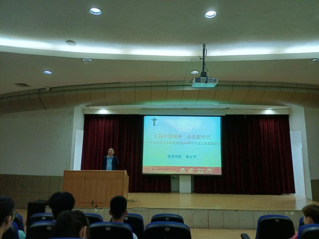 高立平书记讲座的主题是《弘扬中国精神 奋进新时代》,认真学习习近平在庆祝建党100周年庆祝大会上的讲话精神,首先回顾百年来中国共产党的历程和丰功伟绩;二是讲述在中国革命、建设、发展及改革的实践中凝练的中国精神,包括革命精神、建设精神、改革精神、新时代精神及伟大的建党精神的内涵。三是激发大学生弘扬中国精神,做到知理守心、知责担当、知重负重、知恩图报,积极引导大学生立志成长成才,准备为中国特色社会主义现代化强国建设贡献力量。