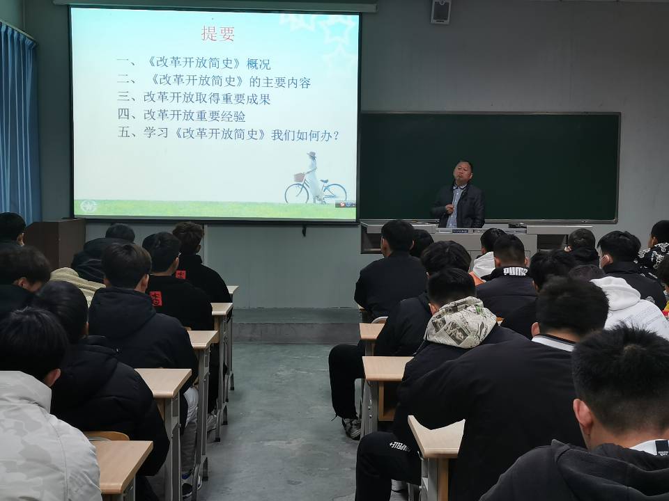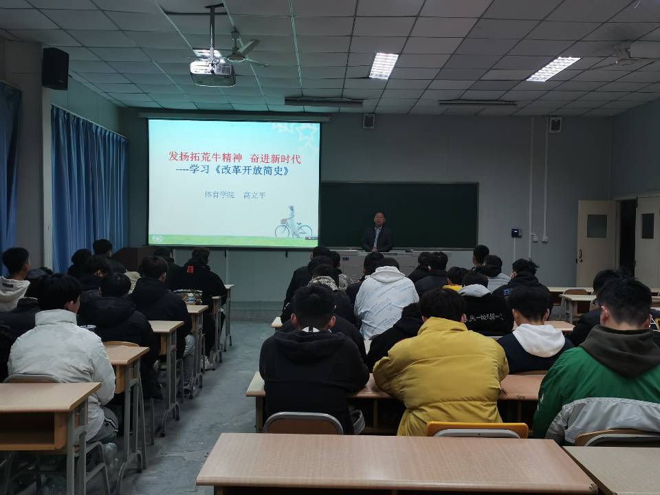 高立平书记以《发扬拓荒牛精神 奋进新时代》为主题,进行《改革开放简史》教育,首先介绍改革开放简史的概况及改革开放简史的主要内容;改革开放取得的重要成果及改革开放的重要经验;结合体育专业实际如何学习改革开放简史,从中汲取营养、智慧和力量,做到学史明理,坚持中国特色社会主义道路。做到学史增信,坚定理想信念做到学史崇德,提高自身的道德修养,做到学史力行,知行合一。进一步解放思想,发扬拓荒牛精神,敢于创新,积极进取,加强体育专业理论和技能提高,练好能力本领,为全面建设社会主义现代化国家、实现中华民族伟大复兴中国梦不懈努力奋斗!